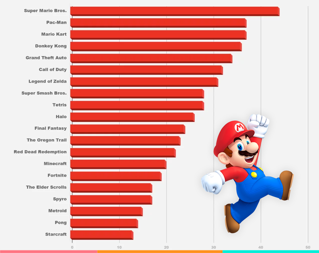 Pero no todo fue Mario y Mario verde, sino que se pueden ver otros clásicos del mundo de los videojuegos como lo son Pac-Man, Donkey Kong, Grand Theft Auto, Call of Duty, The Legend of Zelda, Halo, entre muchos otros. Incluso se puede ver a Mario Kart en la encuesta, con un 34% de los votos.